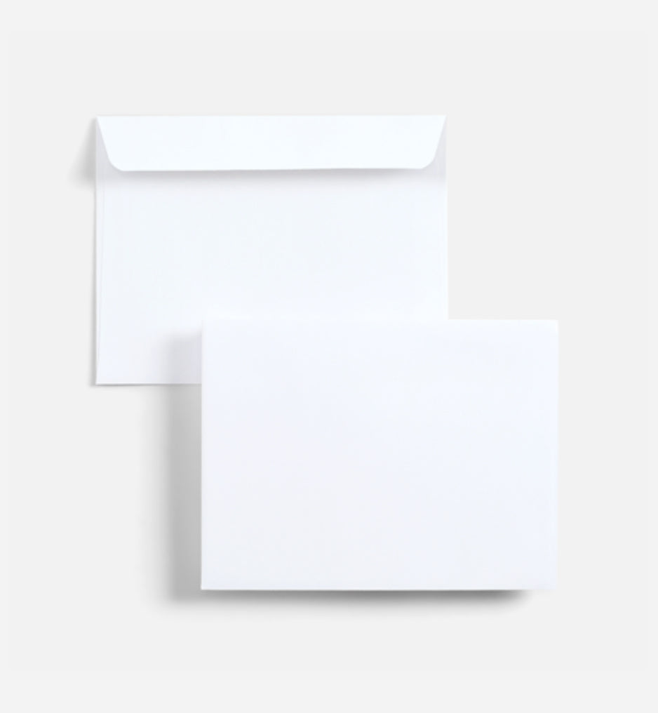 4 in. x 5.5 in. - Folded - Blank interior - Premium Matte - 17.5pt - Thick, high quality card stock - Includes envelope and secured in self-sealing cellophane